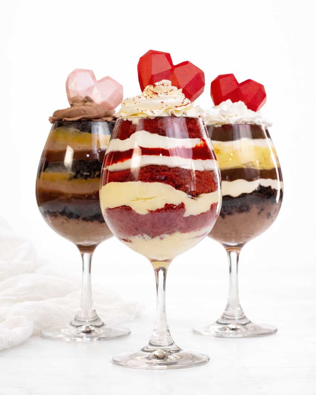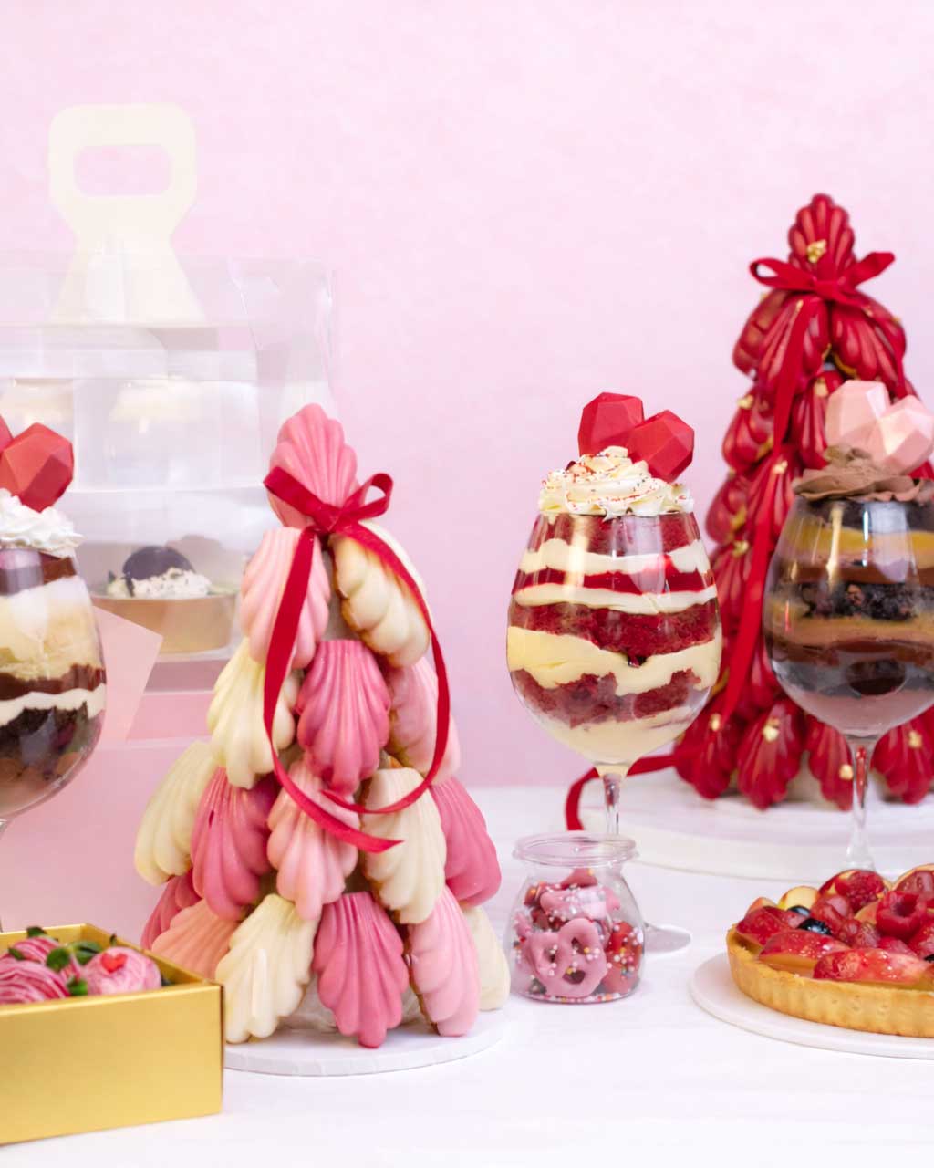 This curated Valentine dessert spread features our signature Madeleine towers in blush and ivory, layered dessert cups, red velvet trifles, chocolate mousse, fruit tarts, brownie bites, and artisanal treats