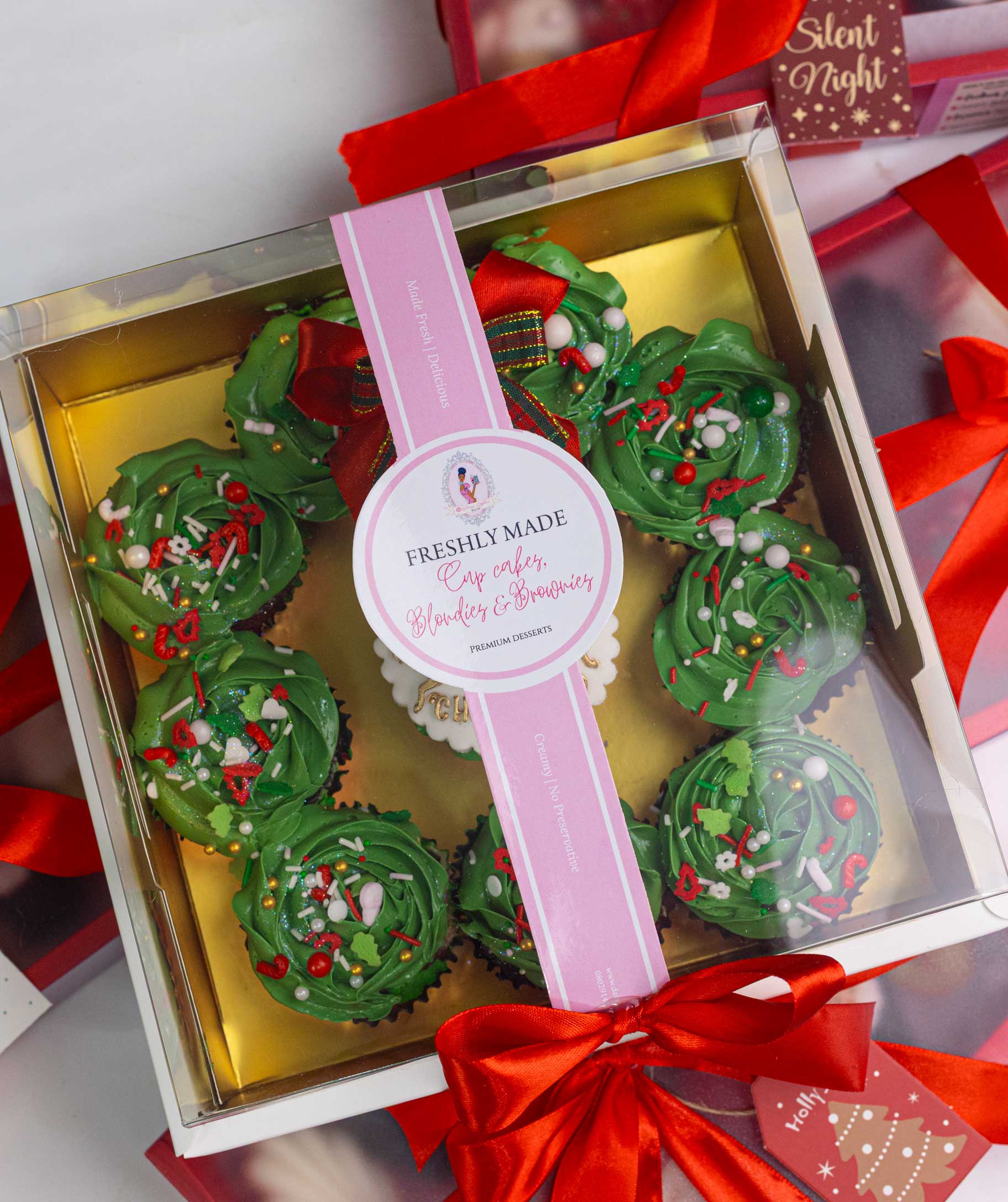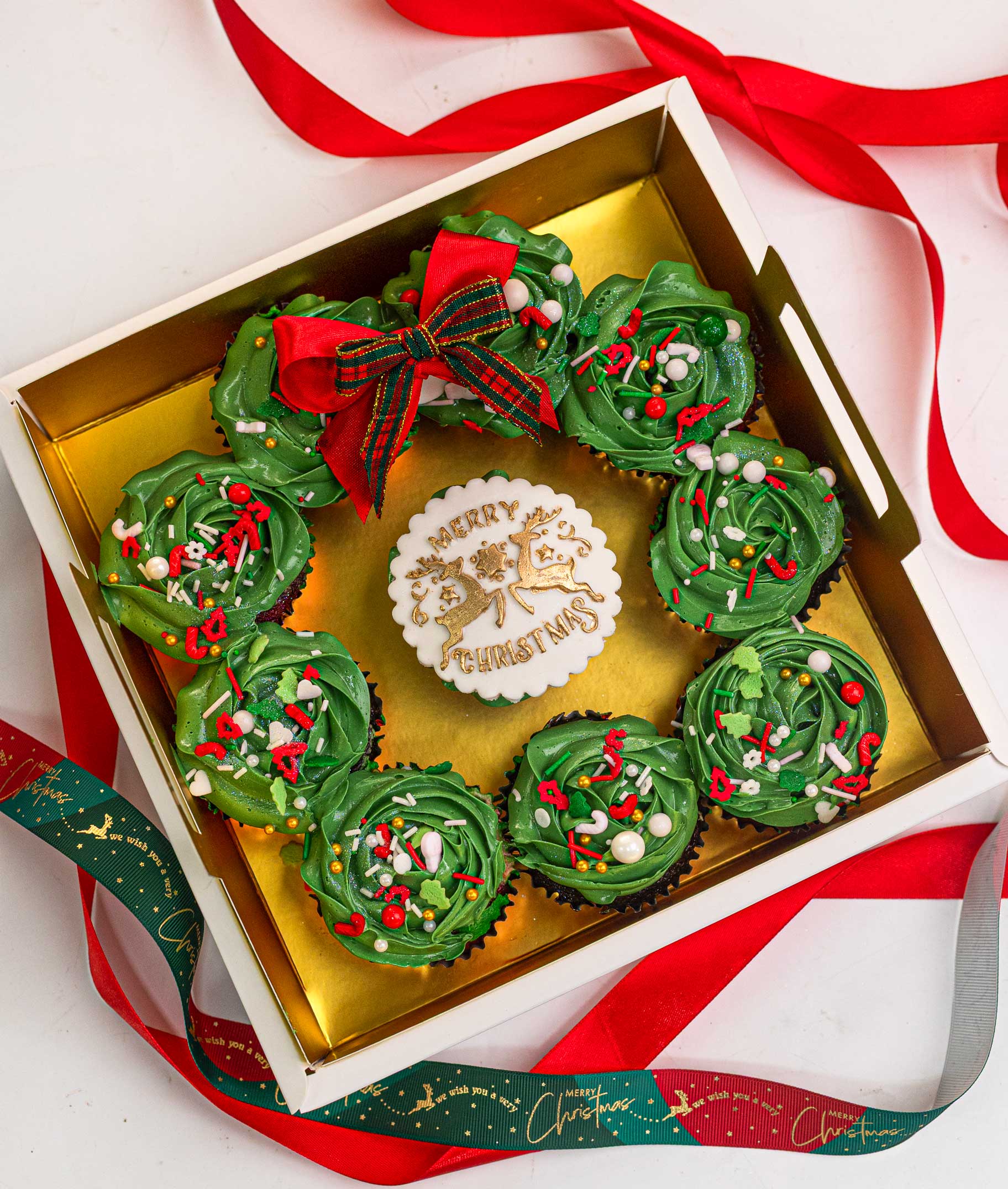 Order our stunning Christmas Cupcake Wreath! Baked in Red Velvet & Chocolate cupcakes, The perfect Christmas Season. Iced with swiss meringue buttercream