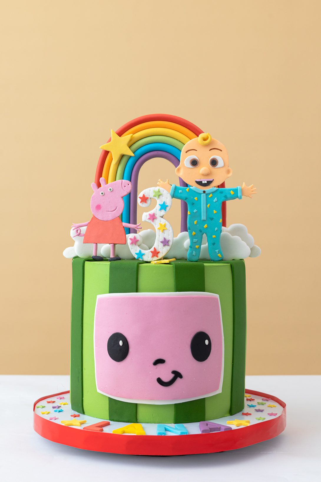Cocomelon fondant cake for kids party. 4 to 5 layers of delicious cakes layered with buttercream & covered in fondant.