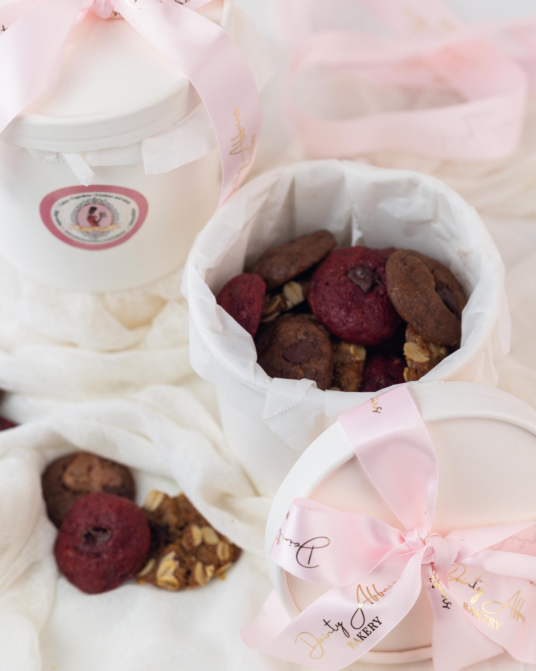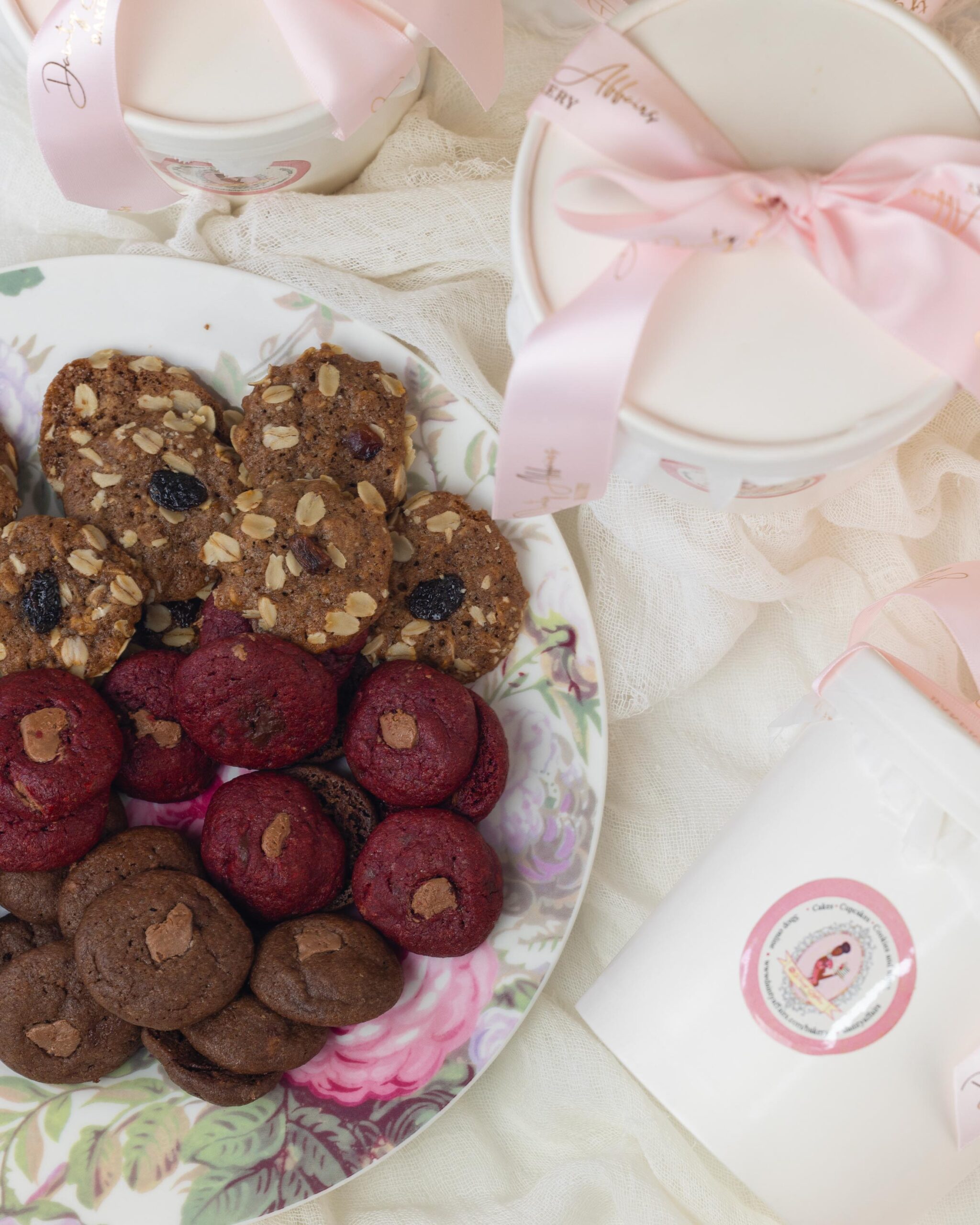Assortment of our best selling Signature Cookies: Oats & raisins cookies, Double chocolate cookies and Red Velvet Chocolate cookies.