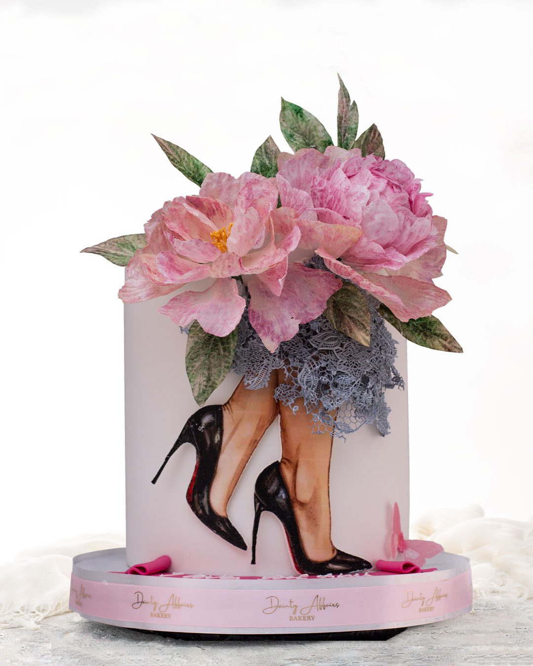 Stiletto and floral Birthday Party cake. Filled with butter-cream and iced with fondant. Image displayed is the tall version