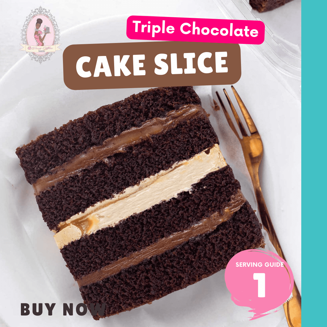 Triple Chocolate Cake Slice with a decadent Chocolate Cream & Salted Caramel drizzle. Get a full Chocolate Cake experience HERE