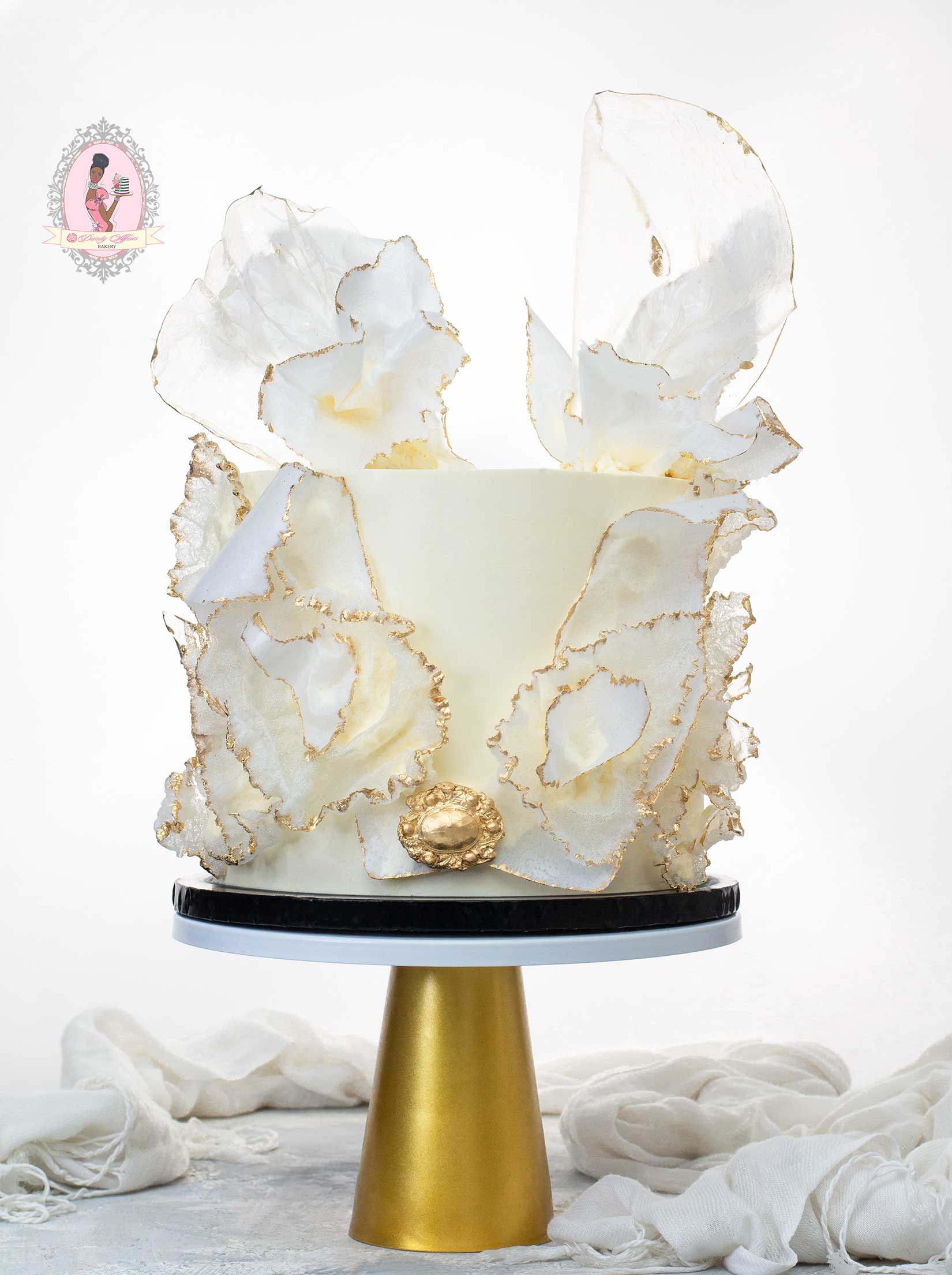 All white cake design of freshly baked cakes filled and iced with American style butter-cream with rice & wafer paper adornment.